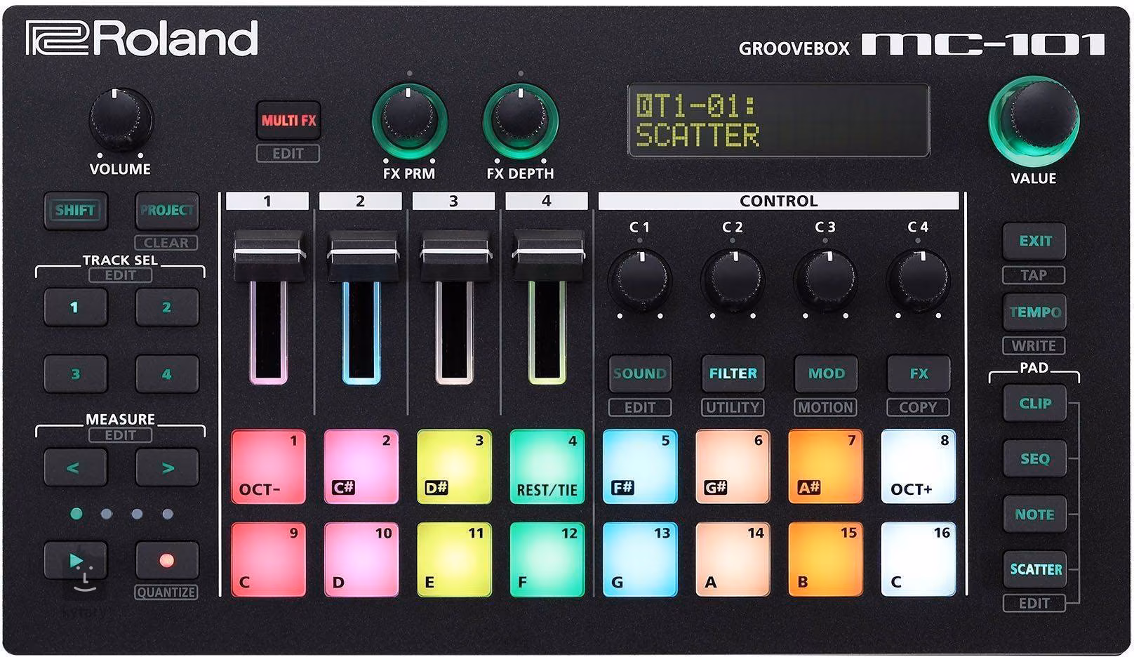 Model MC-101 je vybaven čtyřstopým sekvencerem optimalizovaným pro dnešní elektronickou hudbu zaměřenou na tanec. Se 16 RGB pady můžete vytvářet bicí, basové a syntezátorové Patterny a produkovat tak svou vlastní originální hudbu. Prozkoumejte celé hudební hřiště, kde snadno zkombinujete smyčky a jednorázové samply s melodickými frázemi, a to včetně vašich vlastních MIDI sekvencí a importovaných nahrávek. Můžete skládat a spouštět klipy, přetvářet aranžmá a opětovné samply, nahrávat automatizaci a mnohem více.
