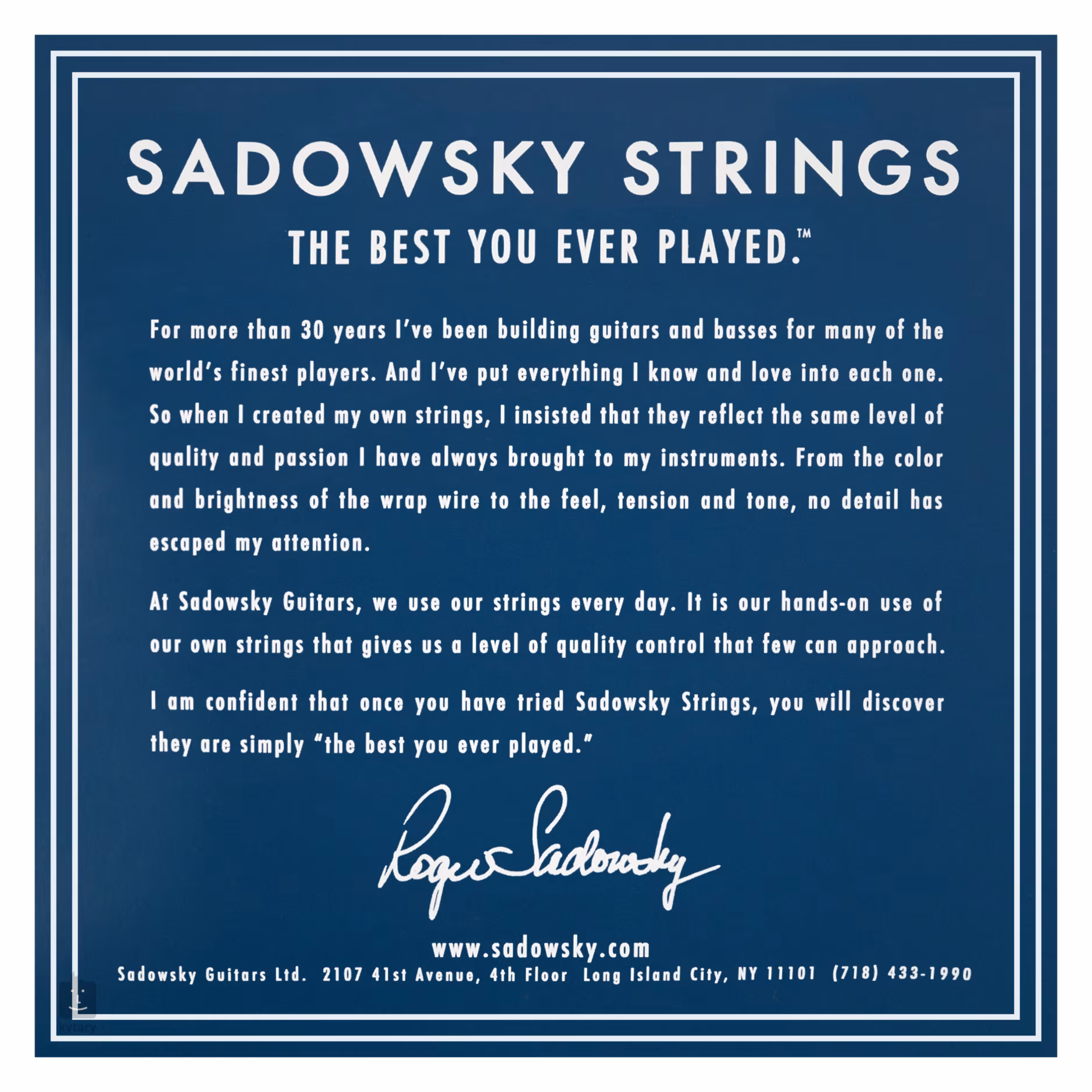 Baskytary značky Sadowsky patří mezi zcela výjimečné nástroje, které si získaly srdce mnoha známých hráčů. Neméně výjimečné jsou také struny Blue Label, které představují standardní řadu strun s nižší tenzí a bohatými středy. Sada Stainless Steel je vyrobena z nerezové oceli, která je navinutá na šestihranném ocelovém jádru, což je osvědčená kombinace, která produkuje ostrý, průrazný zvuk. Ocel je zároveň přirozeně odolná proti korozi, takže poskytuje dlouhou životnost.