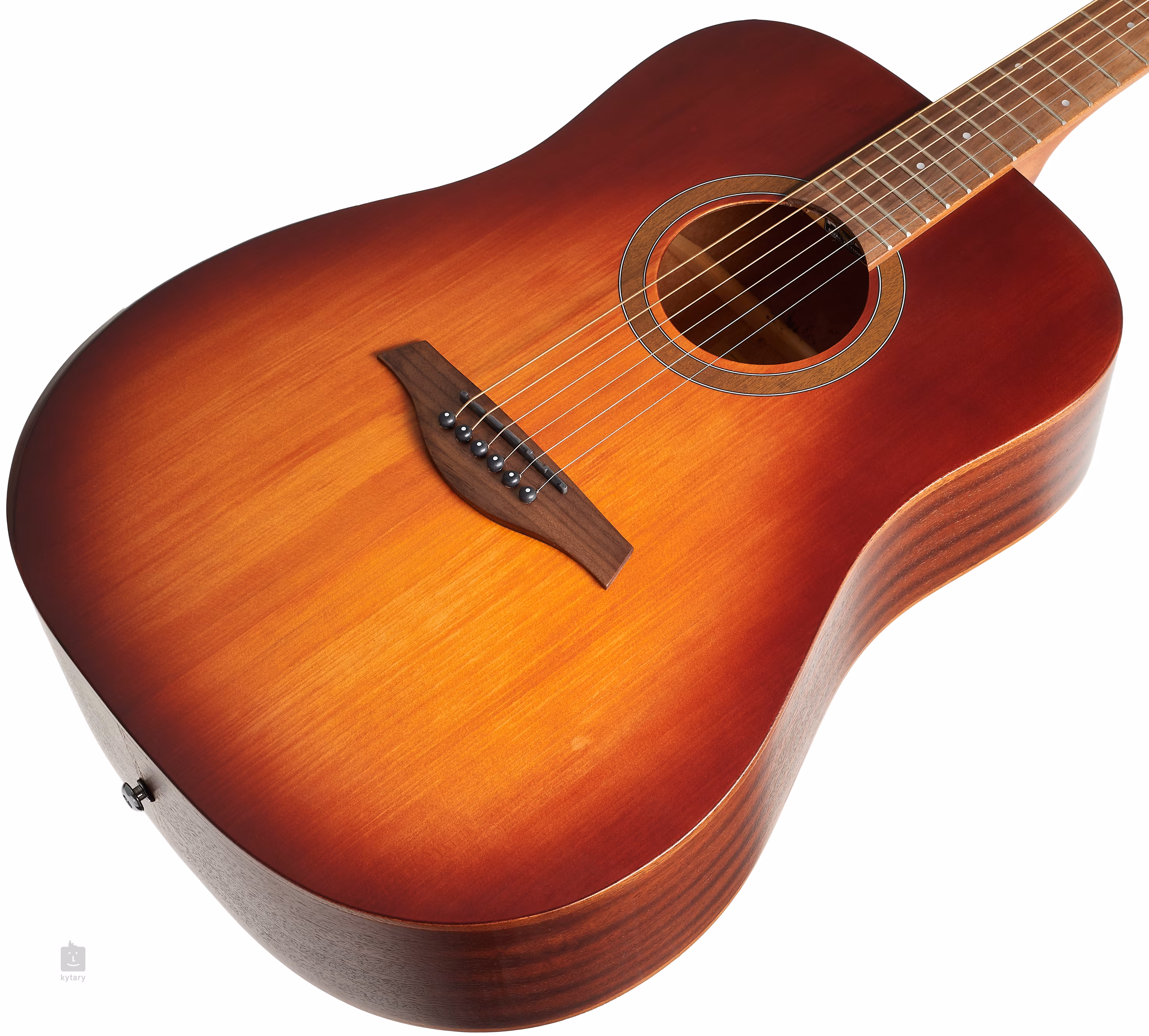 Soundsation EDGE ST DN-BSB je cenově dostupná akustická kytara s velkým rezontaním tělem typu Dreadnought vhodná nejen pro začínající hráče. Přední deska kytary je zhotovena z překližovaného smrku, zadní deska a luby jsou vyrobeny z překližovaného sapele. Ke krku z okoumé s příjemným “C” profilem je přilepen ořechový hmatník osazený dvaceti pražci.