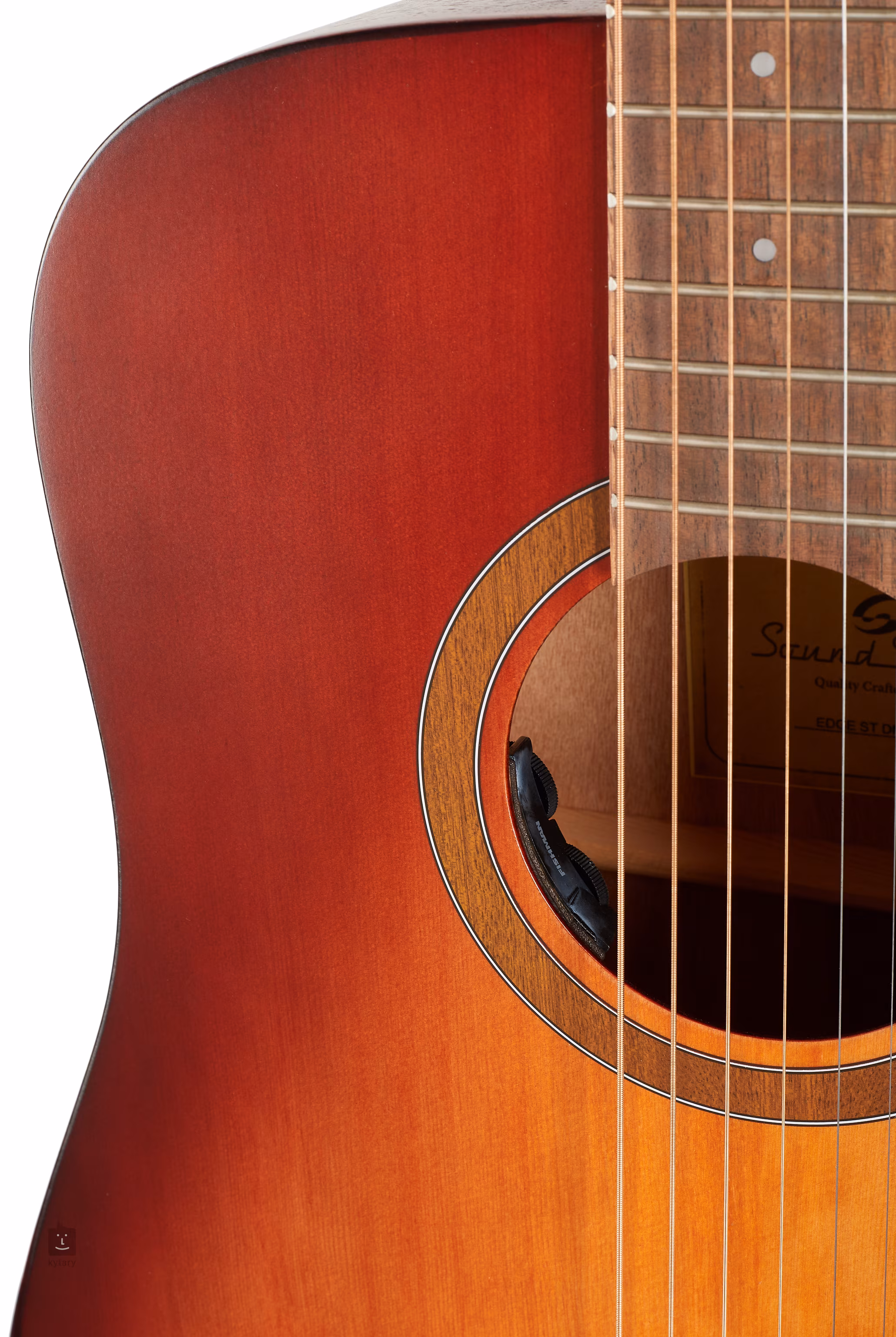 Soundsation EDGE ST DNCE-BSB je cenově dostupná elektroakustická kytara s velkým rezontaním tělem typu Dreadnought vhodná nejen pro začínající hráče. Přední deska kytary je zhotovena z překližovaného smrku, zadní deska a luby jsou vyrobeny z překližovaného sapele. Ke krku z okoumé s příjemným “C” profilem je přilepen ořechový hmatník osazený dvaceti pražci. Dohmat na vyšších polohách hmatníku usnadňuje spodní výřez těla. Struny jsou uchyceny v chromovaných die-cast ladících mechanikách a ořechové kobylce. Stylové zpracování podtrhuje finiš open pore brown sunburst satin a mahagonová lemovka a opěrka ramene. Možnost ozvučení nabízí preamp Fishman GT-1 s ovladači Volume a Tone v ozvučnicovém otvoru nástroje.