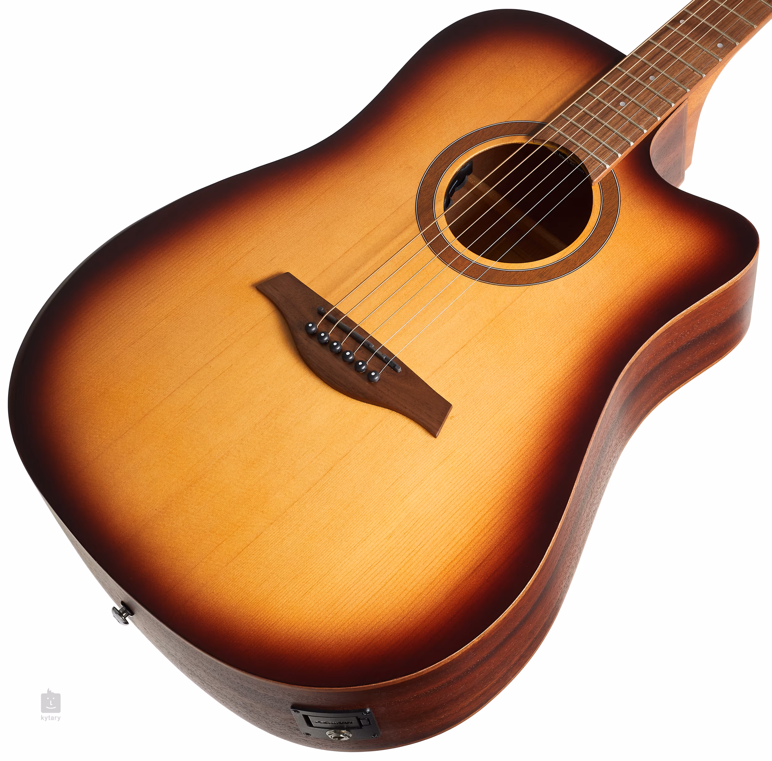 Soundsation EDGE ST DNCE-YSB je cenově dostupná elektroakustická kytara s velkým rezontaním tělem typu Dreadnought vhodná nejen pro začínající hráče. Přední deska kytary je zhotovena z překližovaného smrku, zadní deska a luby jsou vyrobeny z překližovaného sapele. Ke krku z okoumé s příjemným “C” profilem je přilepen ořechový hmatník osazený dvaceti pražci. Dohmat na vyšších polohách hmatníku usnadňuje spodní výřez těla.