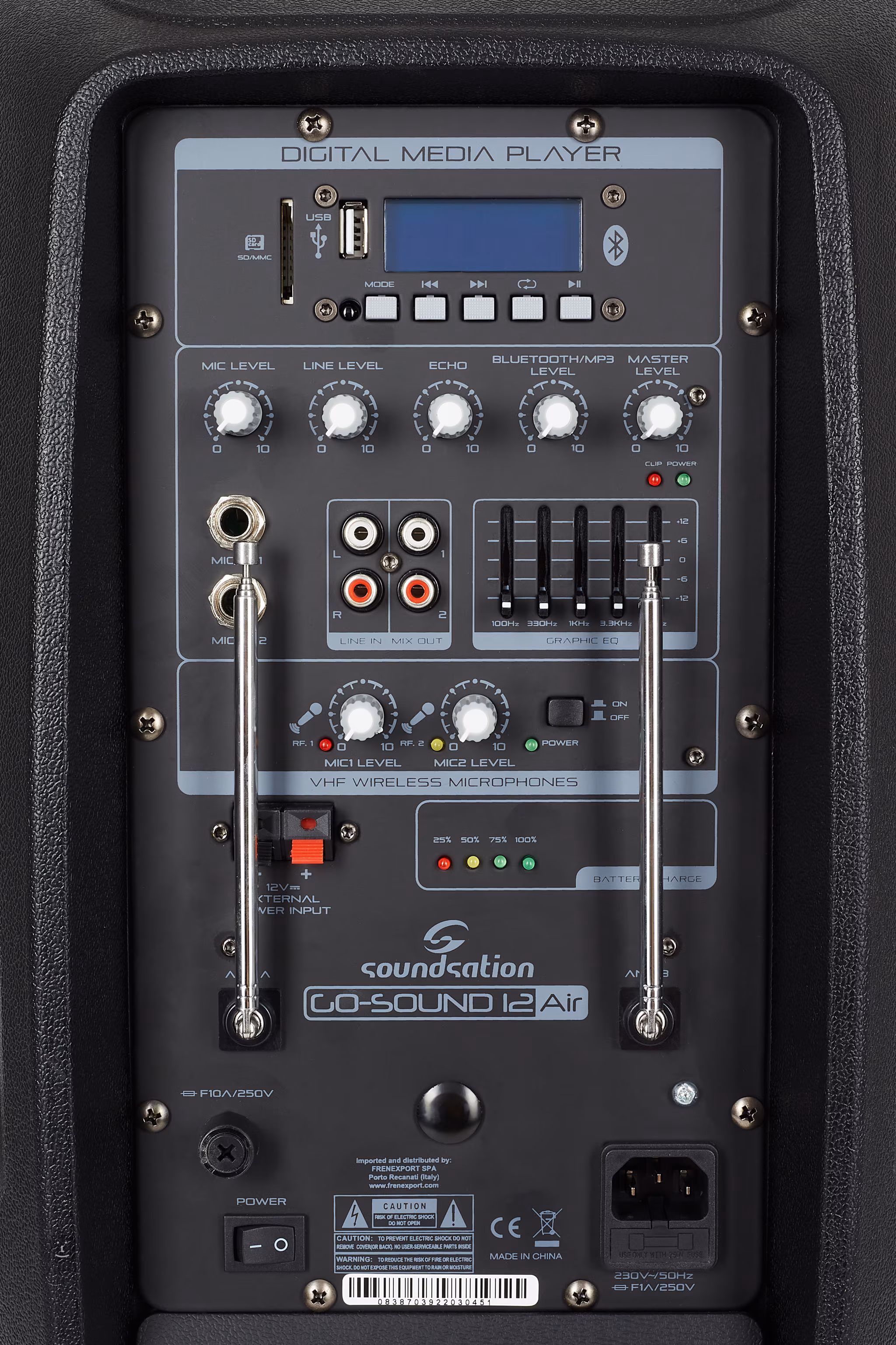 Go-Sound Air od firmy Soundsation je série aktivních dvoupásmových reproboxů s polypropylenovým kabinetem, který je velmi odolný a zároveň lehký. Tento všestranný PA systém disponuje zesilovačem třídy AB, integrovaným MP3 přehrávačem, Bluetooth technologií, dvěma VHF ručními mikrofony, pětipásmovým grafickým ekvalizérem a slotem pro SD paměťovou kartu či portem pro USB Flash disk.