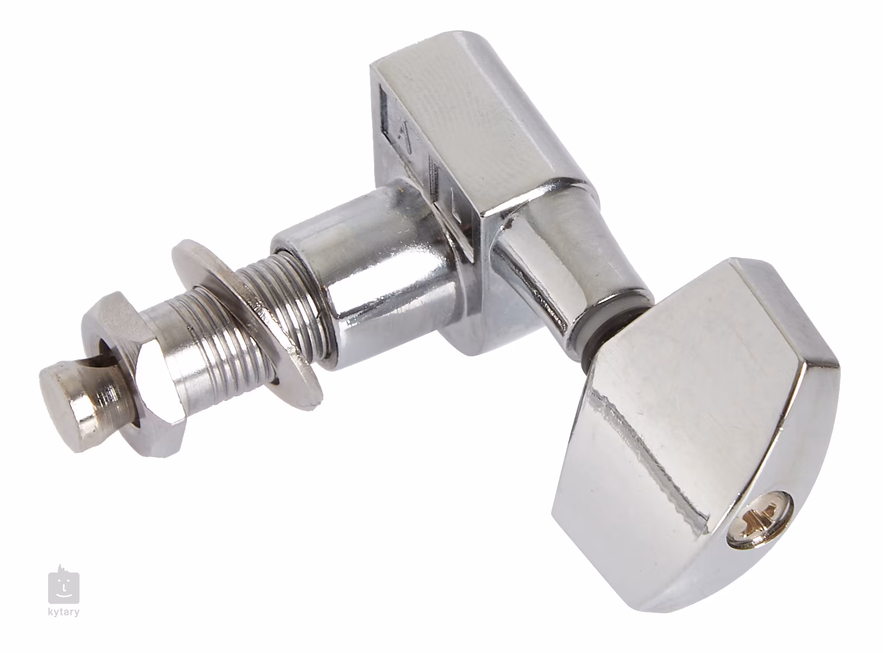 Set chromovaných ladicích mechanik pro elektrickou kytaru. Balení obsahuje šest kusů (tři pravé a tři levé).