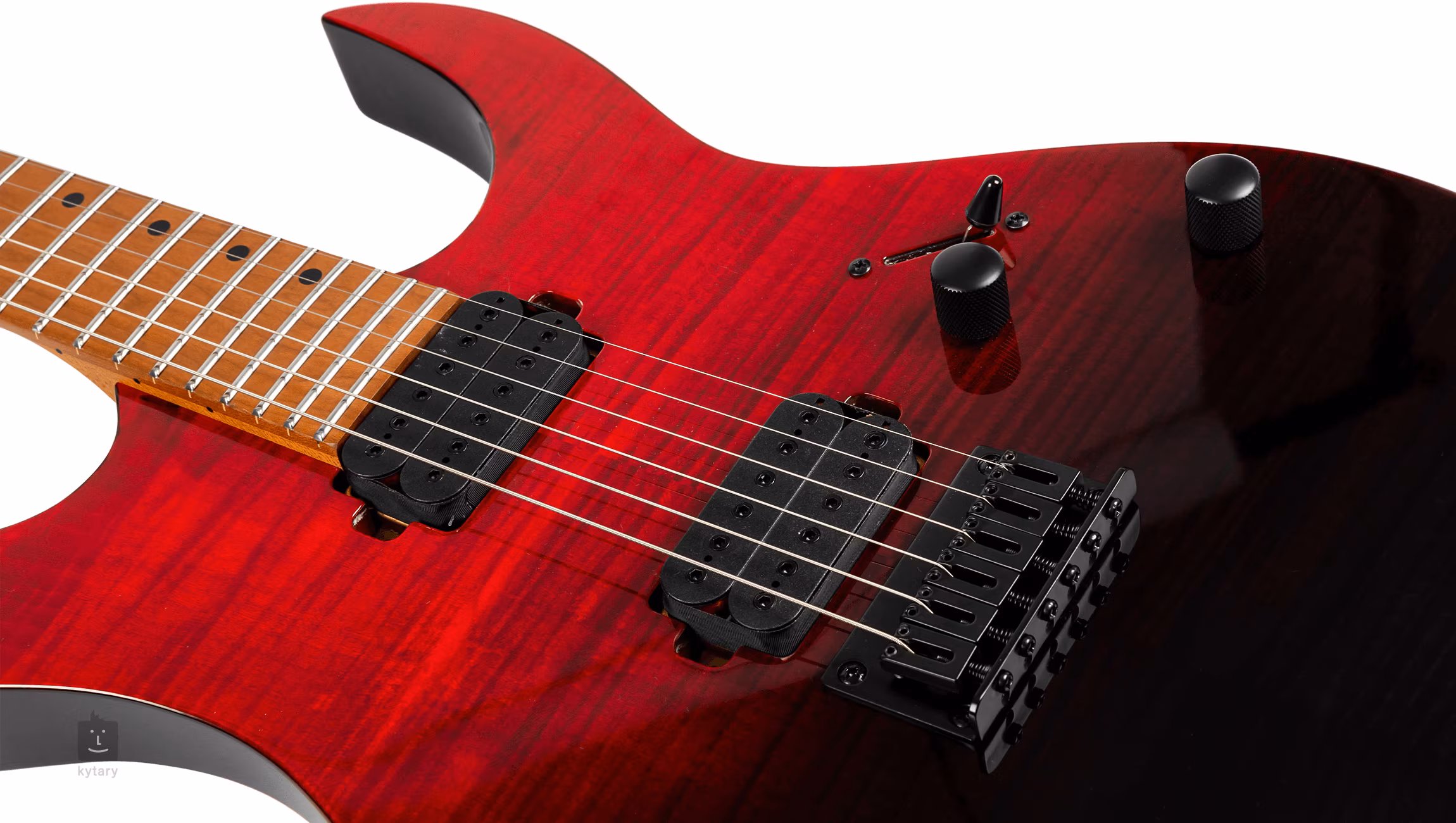 Topolové tělo elektrické kytary Spira Guitars S-450 TRD zdobí vrchní dýha z fládrovaného javoru a barevný finiš Transparent Red. Ke krku z kanadského javoru s “Modern D” profilem je přilepen javorový hmatník osazený čtyřiadvaceti pražci velikosti Jumbo. Díky tepelné úpravě těla, krku a hmatníku je dřevo stabilnější.