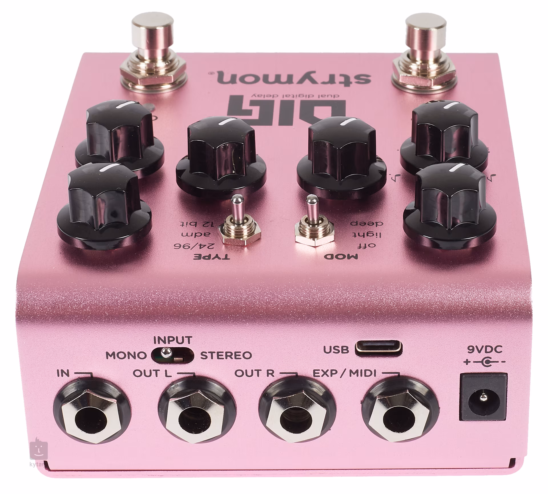 Vstup pro expression pedál umožňuje připojení externího TRS expression pedálu, přepínačů MiniSwitch/MultiSwitch Plus nebo TRS MIDI propojení. Veškerá elektronika je zasazena v odolném a zároveň lehkém hliníkovém šasi. Strymon DIG V2 nabízí volbu mezi true bypass a buffered bypass zapojením. K napájení použijte přibalený 9V adaptér.