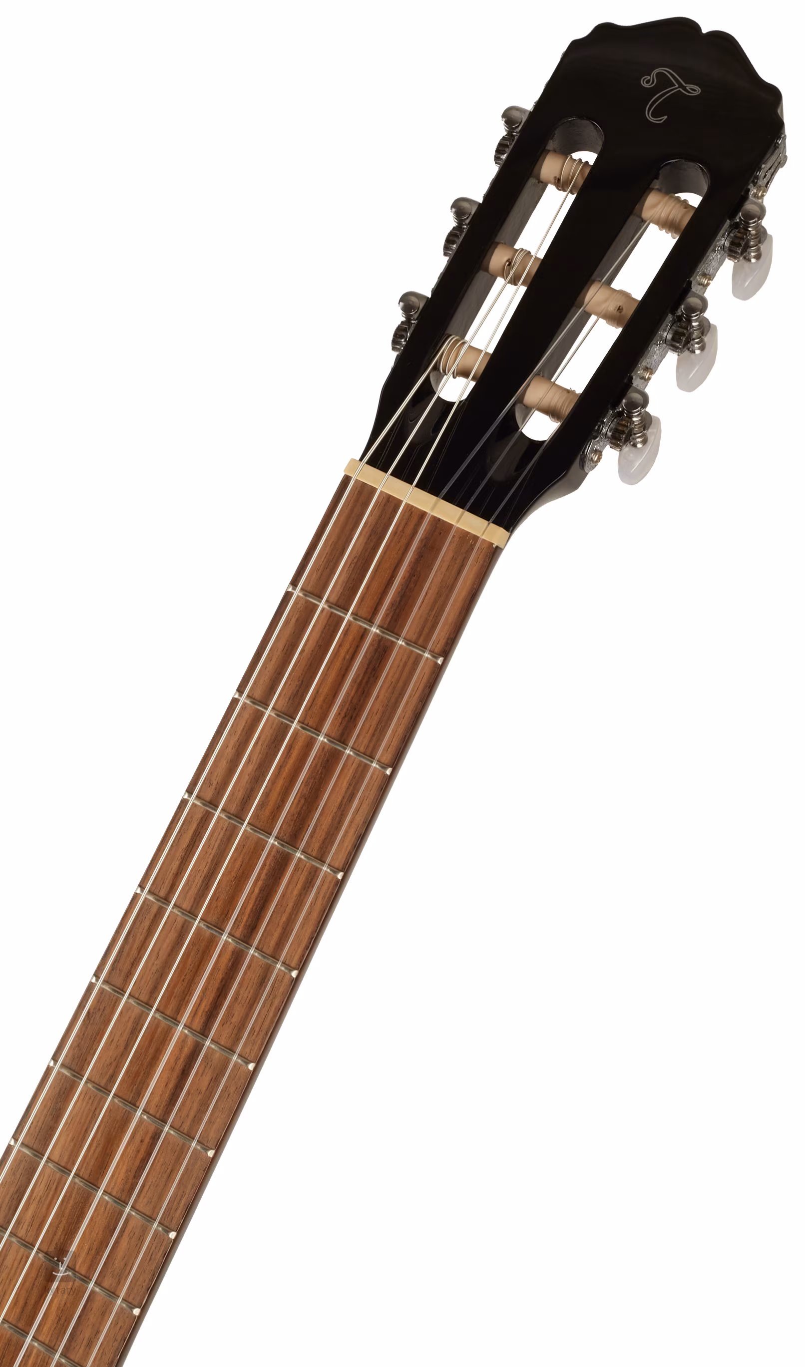 Klasická elektroakustická kytara GC1CE-BLK propojuje svět klasických kytar a zvuku nylonových strun s možnostmi a herním komfortem elektroakustických kytar. Vrstvený korpus nástroje je zhotoven z přední smrkové desky a zadní desku a lubů z mahagonu. K mahagonovému krku je přilepen hmatník z fíkovníku. Dobrý dohmat i na nejvyšších polohách hmatníku zaručuje spodní výřez těla (Venetian cutaway).