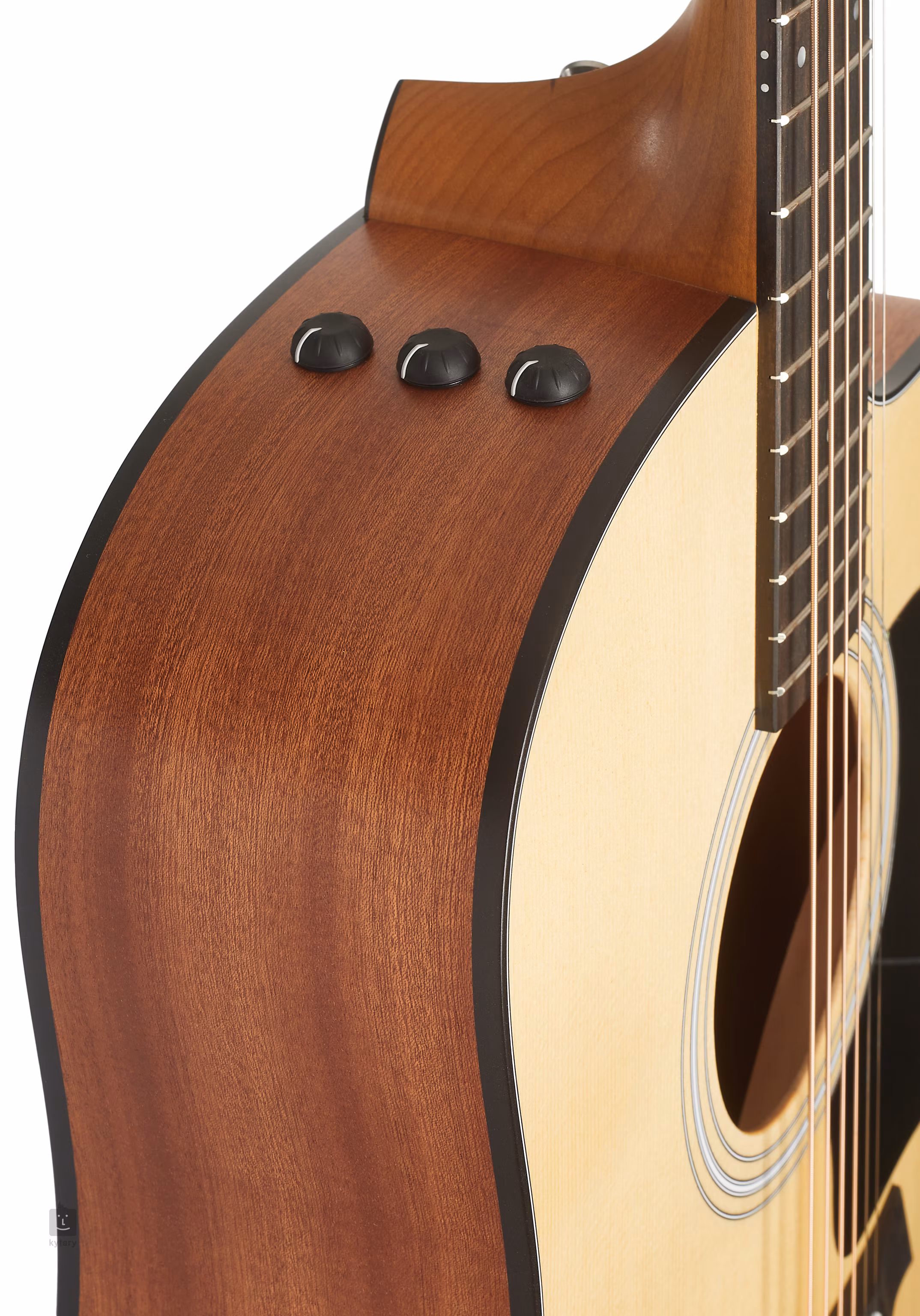 Struny jsou přes sedlo z micarty a nultý pražec z materiálu TusQ uchyceny v chromovaných die-cast mechanikách značky Taylor. Pěkné zpracování podtrhují tradiční prvky v podobě rozety složené ze tří prstenců, černé lemovky těla a praktického černého pickguardu.