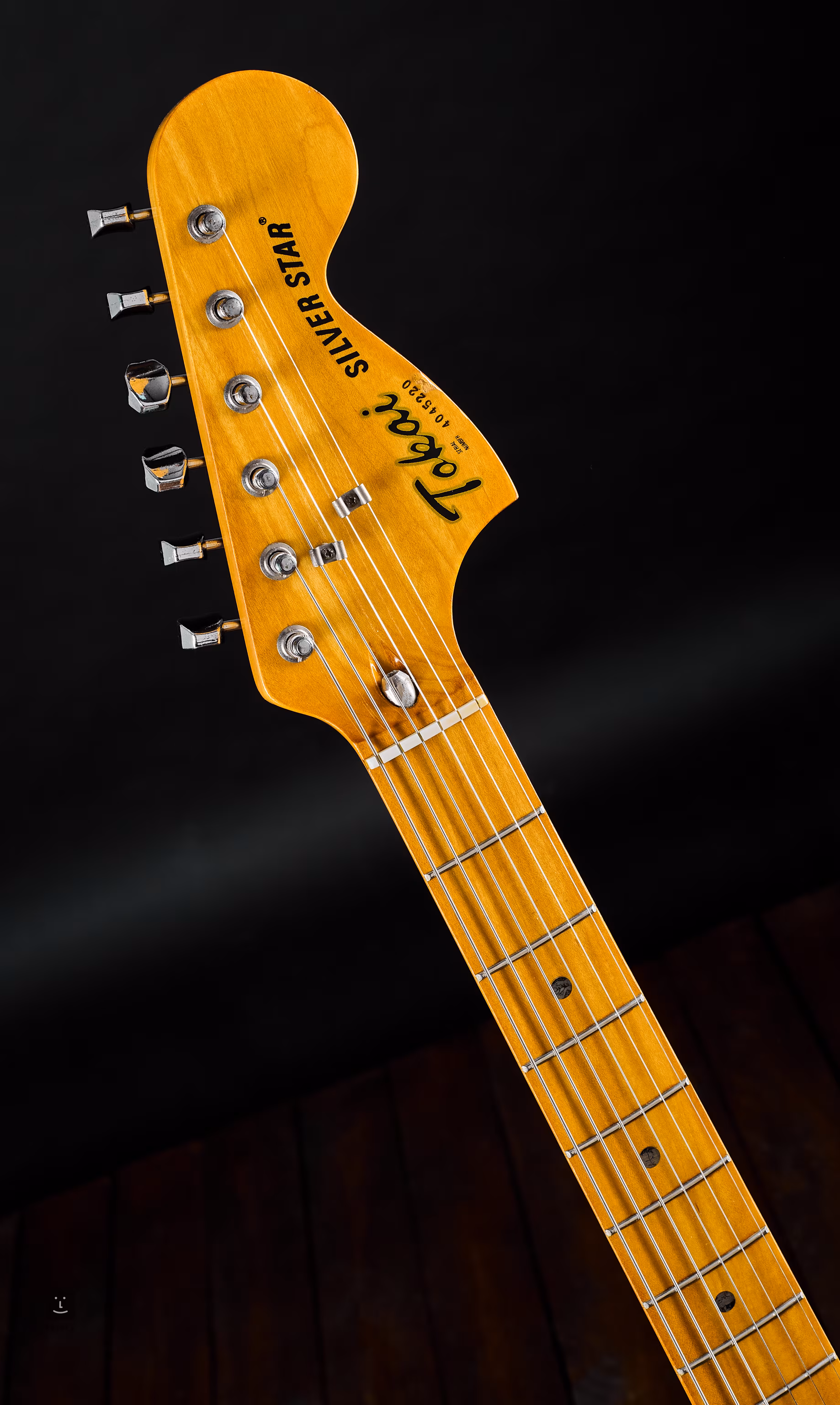 Lawsuit kopie stratocasteru vyrobená kolem roku 1984 v Japonsku podle modelu ze 70. let (velká hlavice a tříšroubový spoj krku).