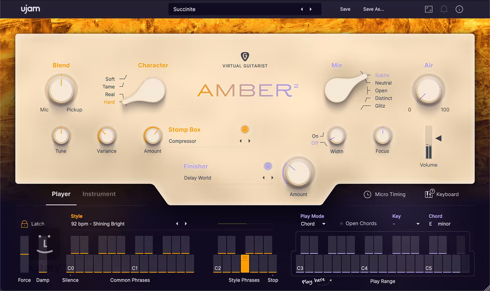 Tento plugin zní jako studiový veterán, který hraje přesně to, co potřebujete. Zvuk Amber 2 je teplý a bohatý, ideální pro indie, pop, rock a další žánry. Kytara byla nahrána s pečlivě vybranými mikrofony, aby se dosáhlo nejlepší možné zvukové rozmanitosti.