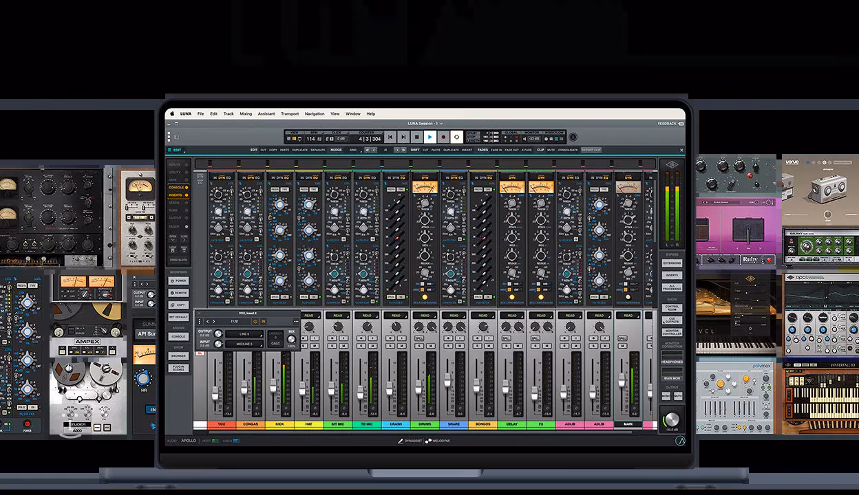 Tento balík je doslova nabitý špičkovými nástroji. Kromě klíčových LUNA rozšíření, jako je channel strip API Vision nebo pásková saturace Studer A800, získáte přístup k arzenálu virtuálních nástrojů včetně syntezátorů Opal a PolyMAX nebo realistického křídla Ravel Grand Piano. Pro mixáž máte k dispozici svatou trojici kompresorů – Teletronix LA-2A, 1176 a Fairchild – i ikonický Pultec Passive EQ Collection. Nově balík obsahuje podporu ARA s pluginem Melodyne Essential pro precizní ladění vokálů a také funkci Hardware Inserts, která umožňuje snadno zapojit váš oblíbený externí hardware přímo do mixu, přičemž LUNA se postará o veškerý routing a kompenzaci zpoždění. Důležité je, že všechny zahrnuté pluginy běží nativně a nevyžadují žádný hardware od Universal Audio.