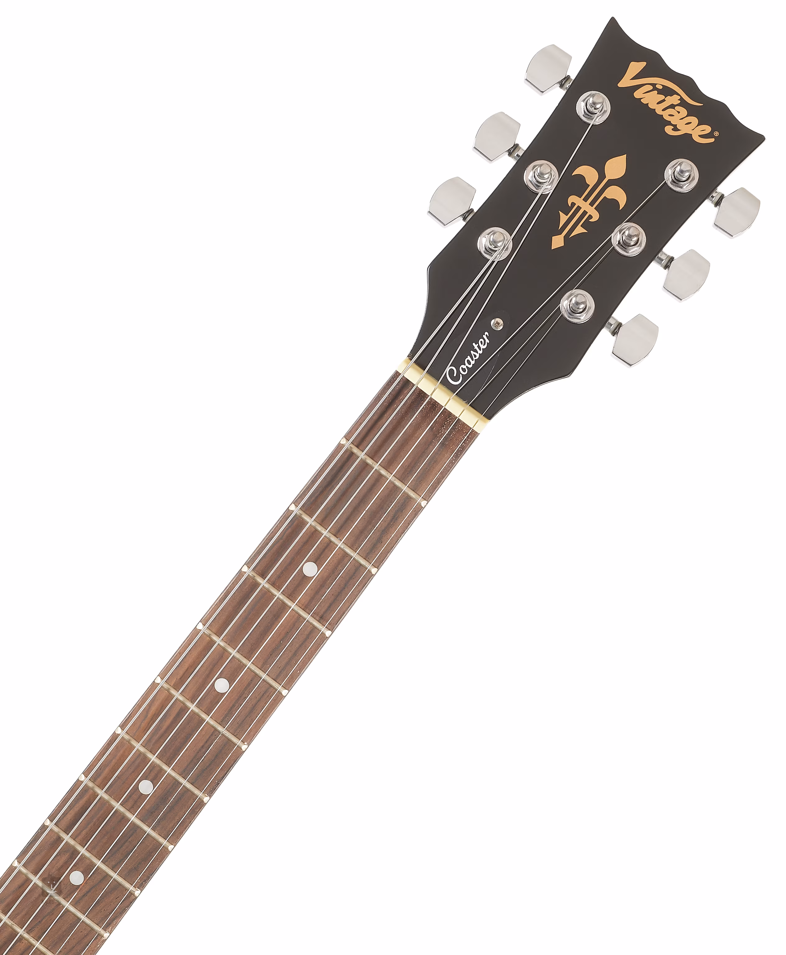 Vintage V10 Coaster Series Gloss Black je elektrická kytara v single-cut tvaru populárních “elpéček”. Tělo nástroje je zhotoveno z lípy. K javorovému krku je přilepen palisandrový hmatník osazený dvaadvaceti pražci.