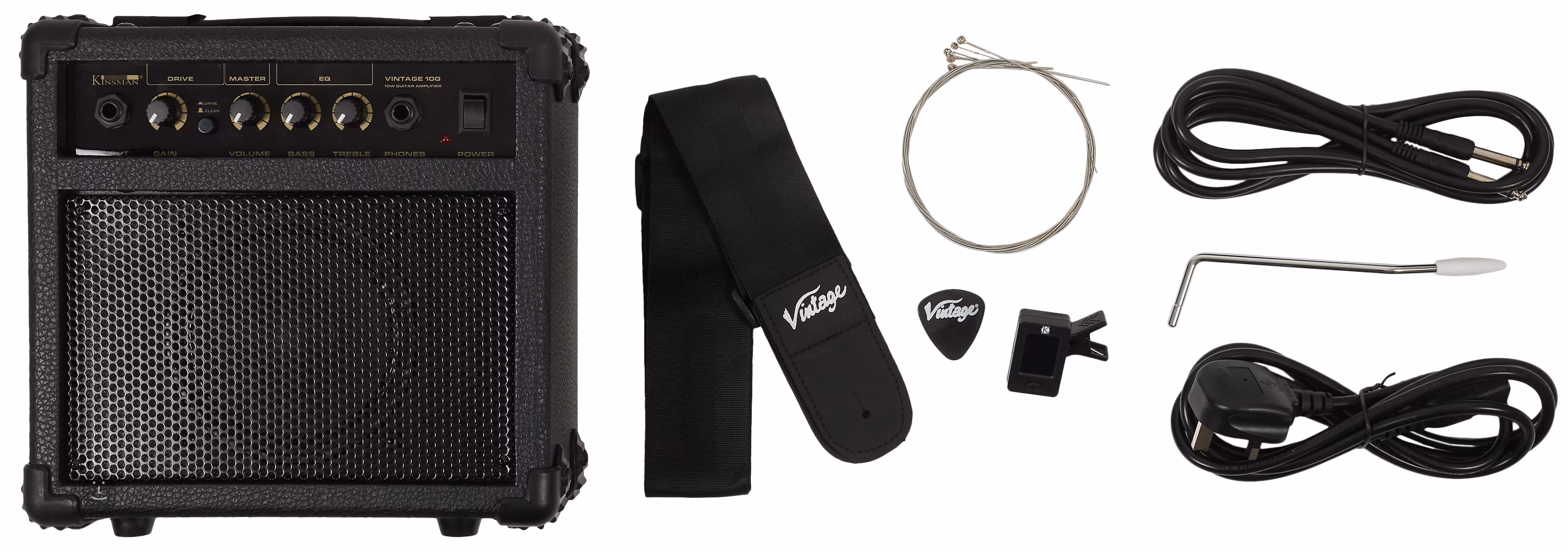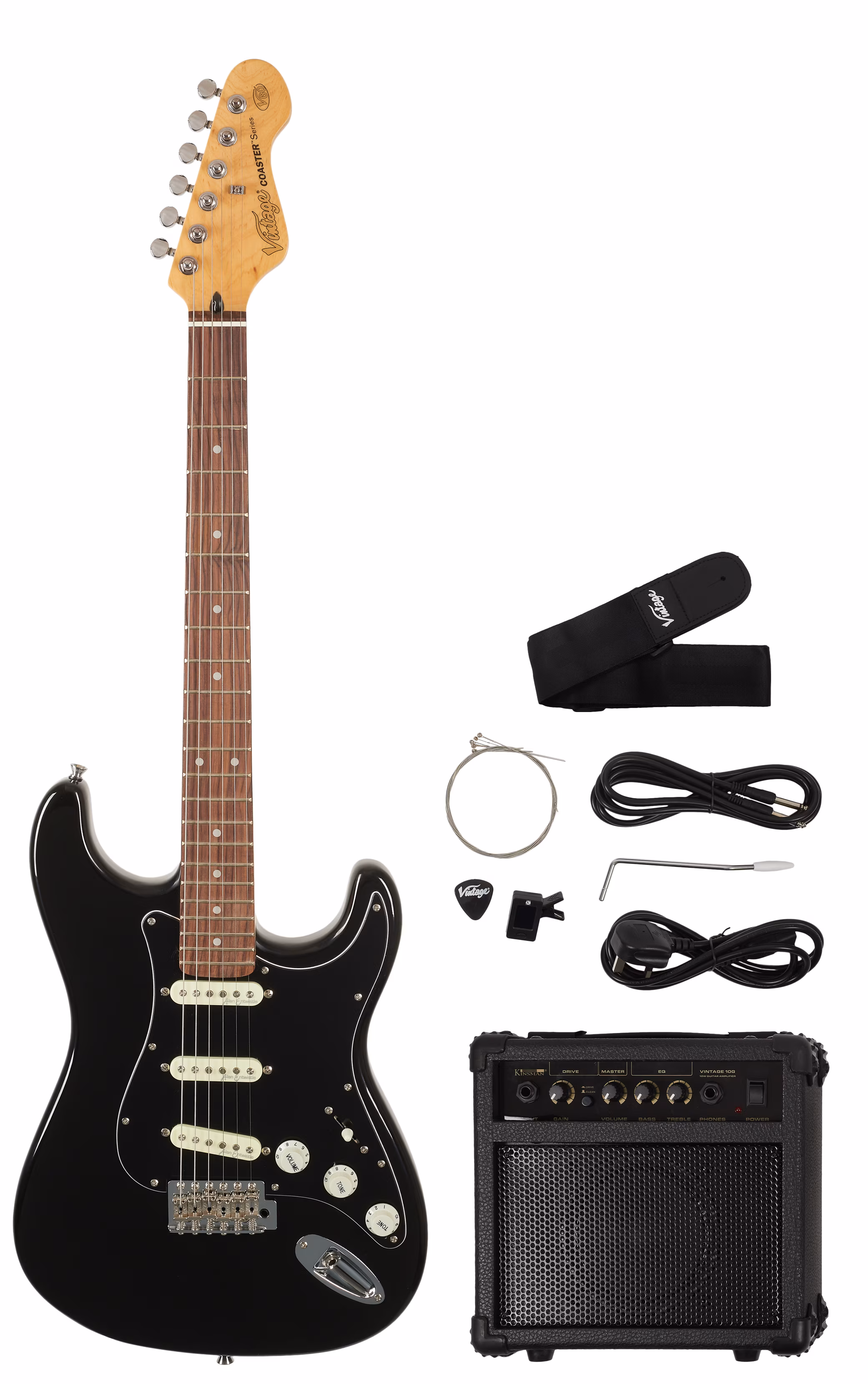 Kytarový komplet Vintage V60 Coaster Series Guitar Pack obsahuje elektrickou kytaru, kytarové kombo Kinsman s výkonem 10W, obal, kytarový popruh, nástrojový kabel, klipovou ladičku, trsátko a náhradní set strun.