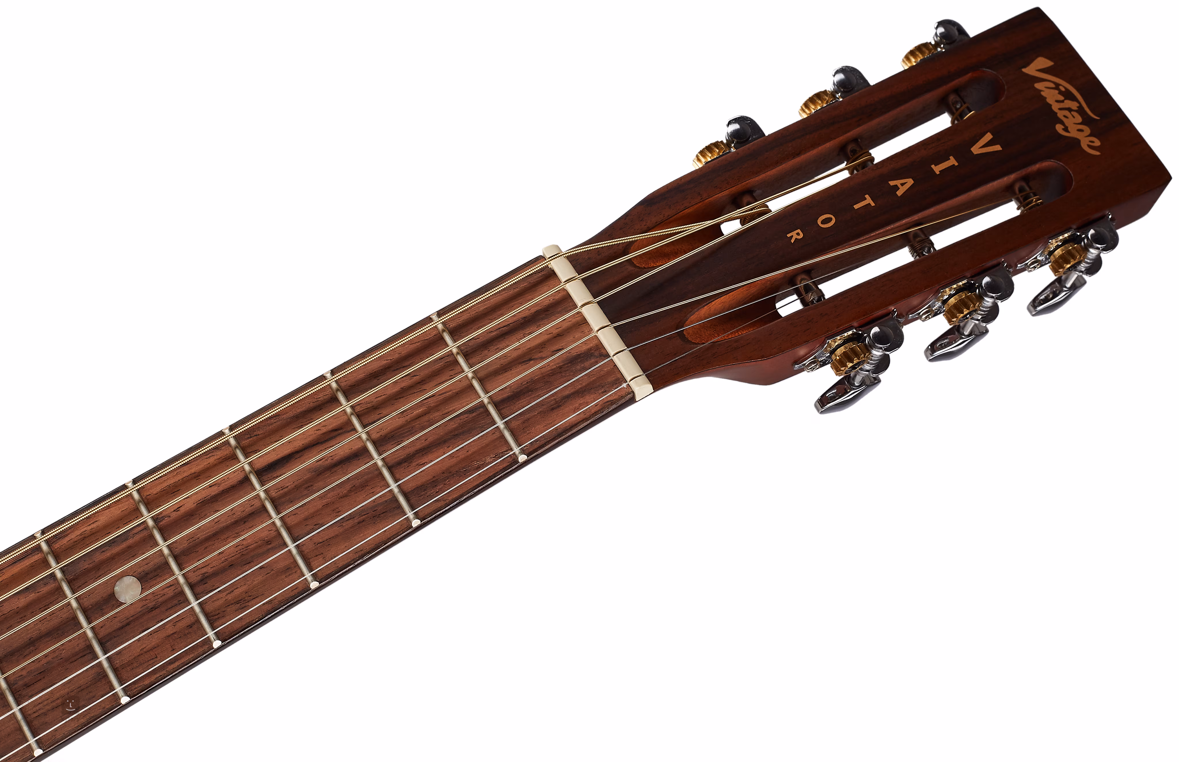 Stabilní ladění zajišťuje palisandrová kobylka se sedlovým pražcem ze syntetické kosti NuBone. Ze stejného materiálu je vyroben i nultý pražec, otevřené ladící mechaniky pochází od firmy Grover a kromě skvělé funkčnosti překvapí také luxusním chromovaným provedením. Kytara je dodávána v polstrovaném obalu s logem firmy Vintage.