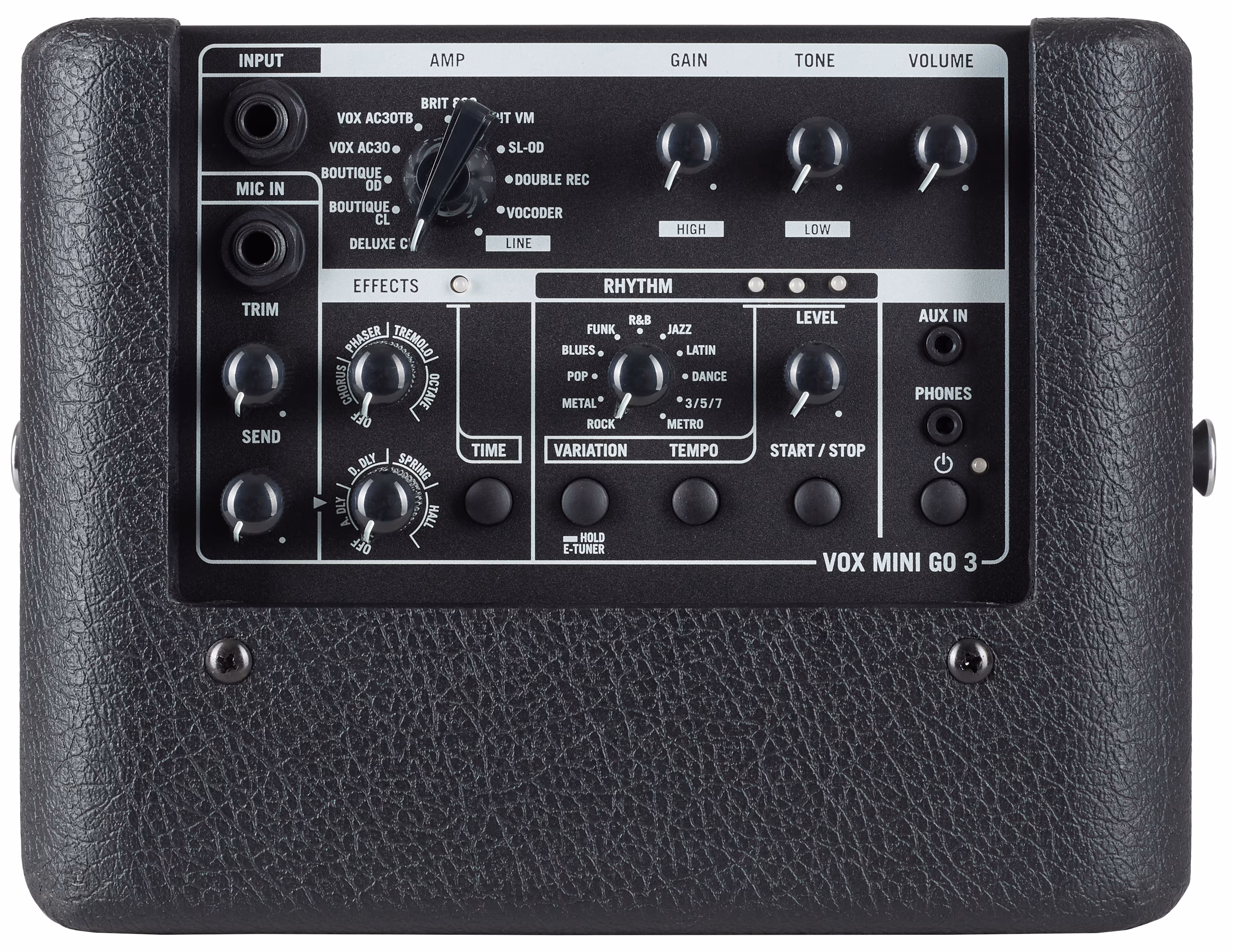 Gain, Tone, Volume, Trim, Send, Amp Selector, Effects 1, Effects 2, Time, Rhythm Select, Rhythm Level, Variation, Tempo, Start/Stop,
