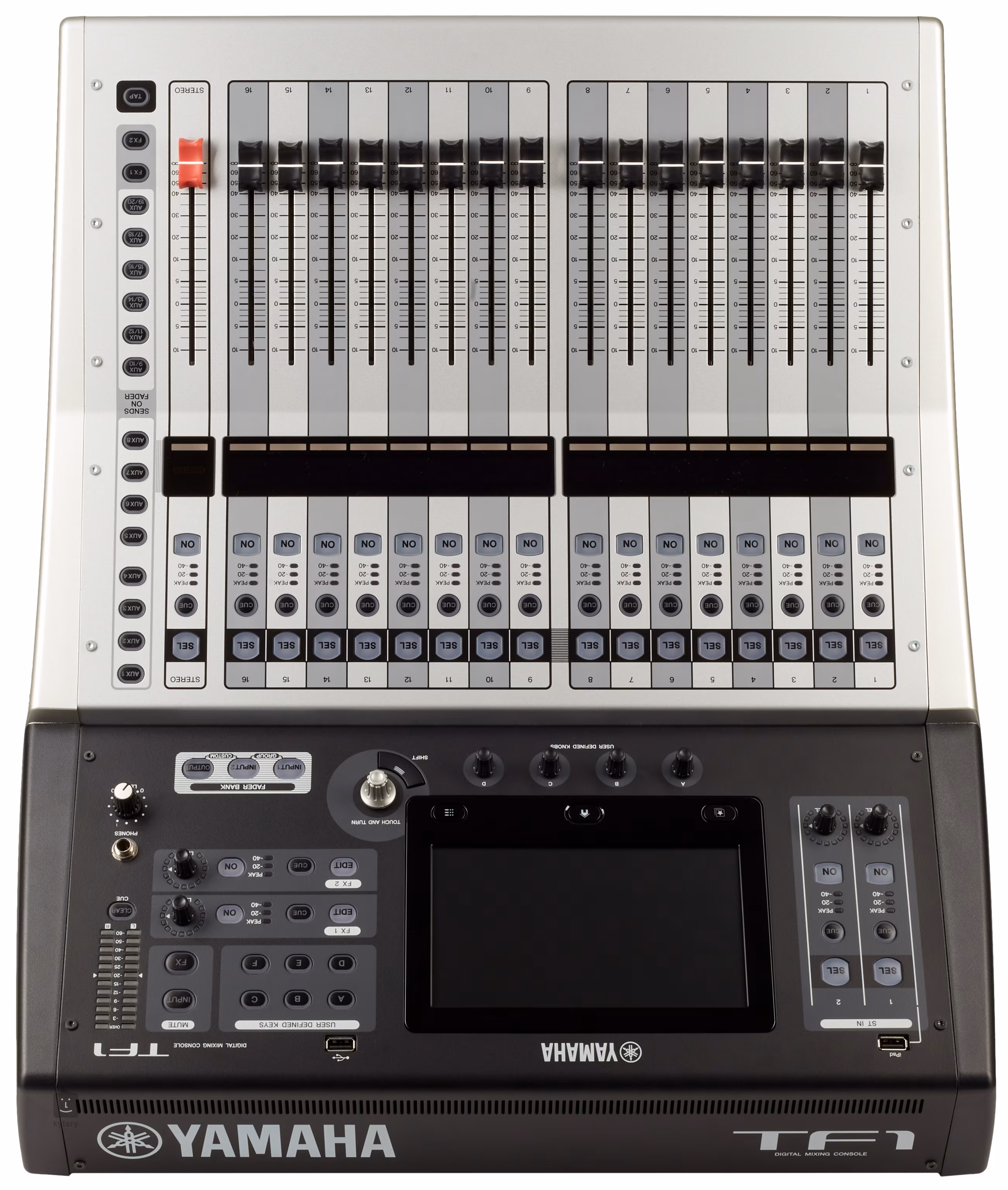 Yamaha TF-1 je nejmenším mixážním pultem této série. Nabízí 17 motorizovaných faderů, 16 analogových vstupů a výstupů, veškeré funkce TF konzolí a lze jí namontovat do racku pro snadný transport. Nechybí také expanzní slot pro kartu NY64-D.