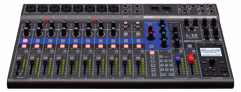 LiveTrak L-12 je digitální mixážní konzole, která v sobě kombinuje mixážní pult, sluchátkový zesilovač, přenosné nahrávací zařízení a audio interface. Umožňuje tak nahrávání a streaming živých vystoupení bez potřeby dalšího vybavení. LiveTrak L-12 je vybavený osmi kombinovanými mono vstupy (XLR/Jack ) a dvěma linkovými TS/RCA stereofonními vstupy. Každý channel strip má přístup k vlastnímu třípásmovému ekvalizéru s parametrickými středy, funkci Low Cut, Pan a šestnácti plně nastavitelným efektům. Kanály 1-8 navíc disponují přepínačem kompresoru. První dva kanály jsou vybavené přepínači pro vysoko impedanční Hi-Z vstupy, kanály 1-4 a 5-8 jsou osazené přepínači pro +48 V. Režimy faderů umožňují poslat pět vlastních monitorovacích mixů a master do pěti individuálních vestavěných sluchátkových výstupů. Nahrávat lze až čtrnáct stop současně a přehrávat dvanáct. Devět scén pro uložení a zpětné vyvolání nastavení zachovávají pozici faderu, nastavení EQ, panoramu a další. Jasný, podsvícený LCD displej a enkodér umožňují přistupovat k intuitivní nabídce a vytvářet nové či vyvolávat starší projekty a upravovat jednotlivá nastavení. Vestavěný slate mikrofon lze použít k nahrávání komentářů nebo talkback. Zabudovaný metronom dále snižuje potřebu dalšího vybavení.